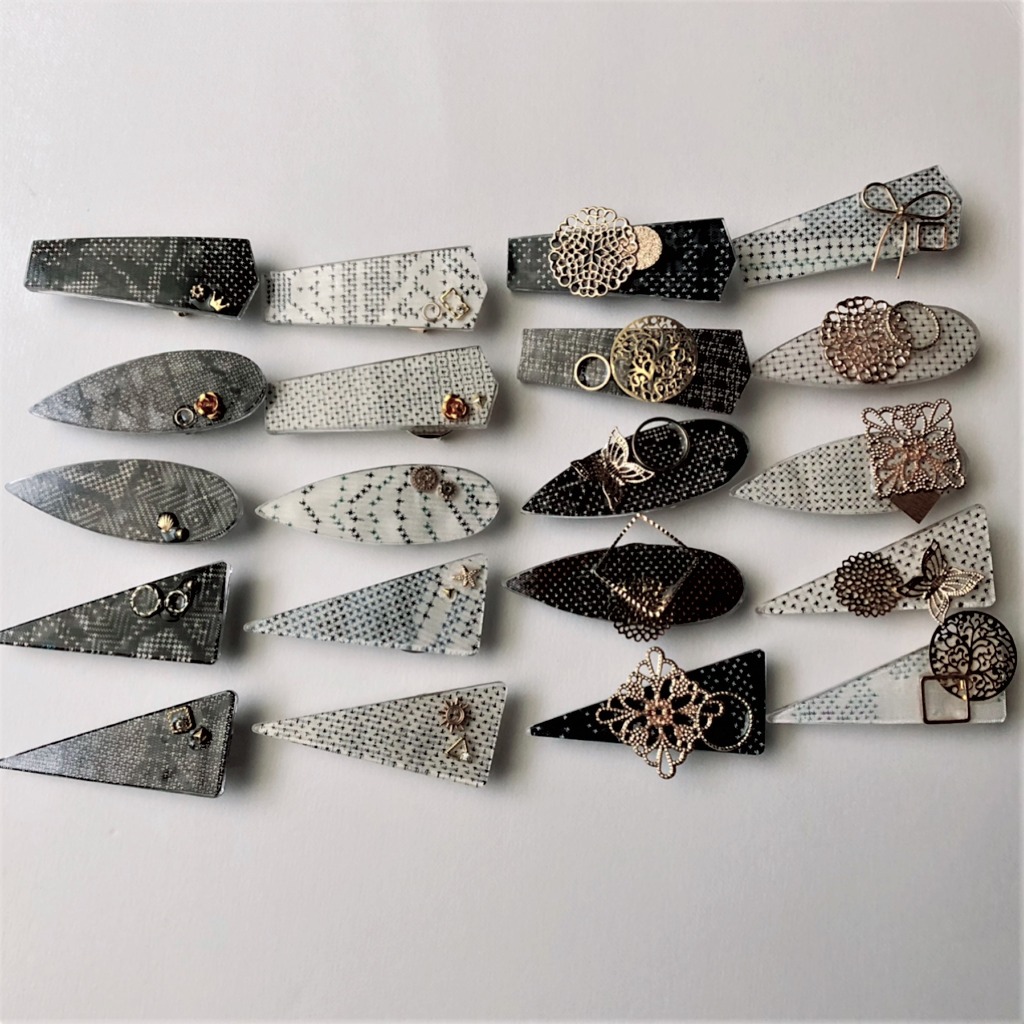 大島紬をレジンで封入したハンドメイドアクセサリー。
