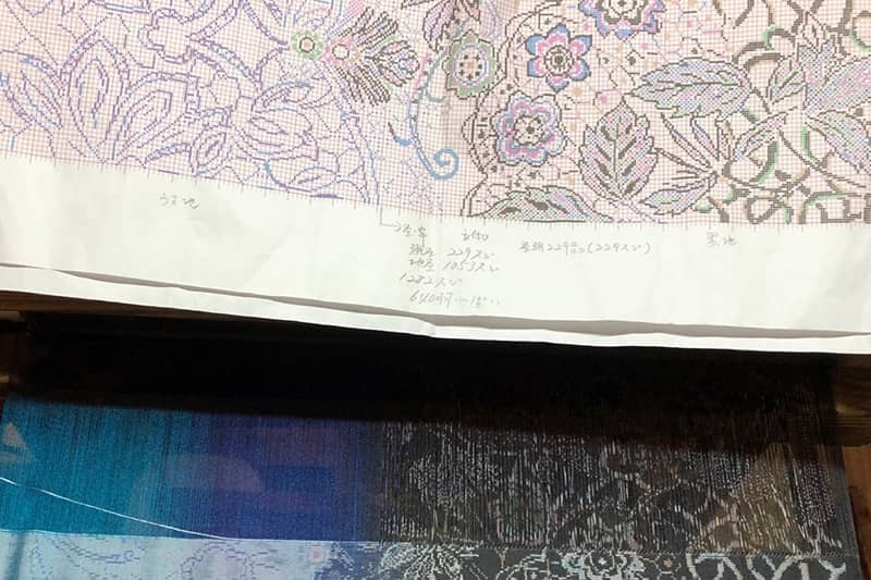 糸に柄付けする。糸1本1本に柄付けしていきます。非常に繊細で高度な技術が求められる作業ですが、柄付けを極めた職人により1本1本キレイな柄が付けられていきます。